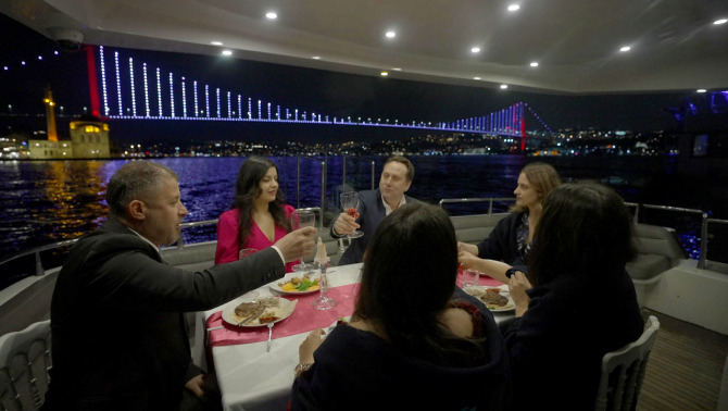Der DJ an Bord sorgt mit Musik für die richtige Stimmung, während Sie an der atemberaubenden Kulisse der beleuchteten Skyline von Istanbul vorbeigleiten...