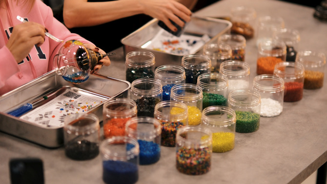- Tutti i materiali (pezzi di vetro, perline, base della lampada, strumenti)